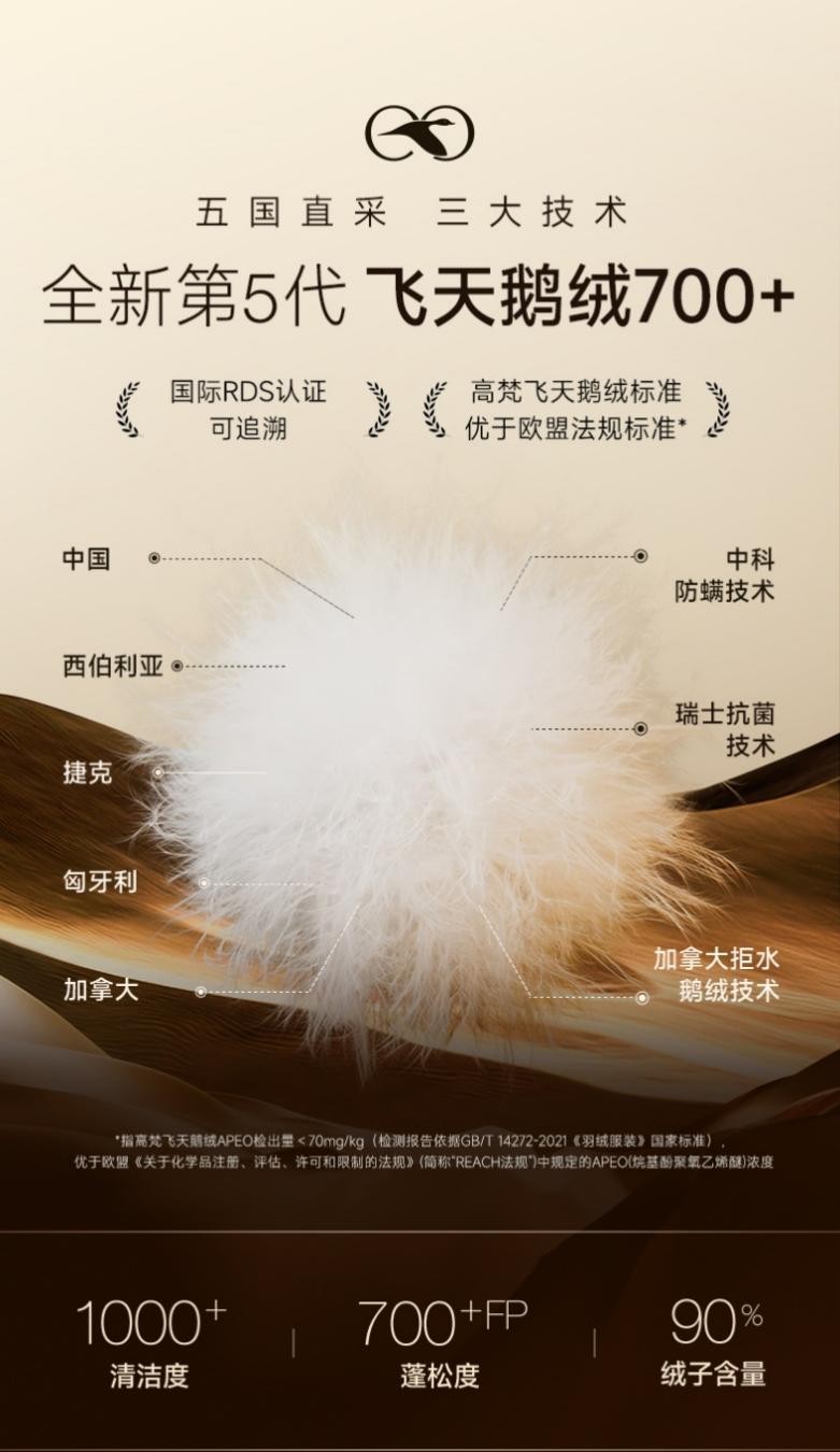 高梵黑金标准,见于产品的每一处细节中。内里采用第五代飞天鹅绒,90%绒子含量,700+蓬松度,1000+清洁度,并获国际RDS认证,让消费者穿的又暖又安心。