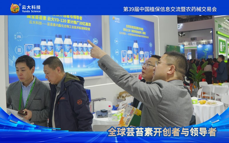本次展会上,云大科技重磅呈现植调剂、植调药肥、特种营养三大核心产品线及多款明星单品及方案,全方位覆盖作物全生长周期的植调与营养需求。其中长效芸苔素系列堪称全场焦点,吸引众多参观者驻足咨询。升级版YD-120将持效期延长至10-15天,让作物调控效果翻倍持久,YD-120在中国市场已累计销售20亿亩次;作为第二代芸苔素标杆的丙先120,持效期长达20-25天,精准覆盖作物全生育关键期,今年恰逢丙先120上市25周年,云大科技丙酰芸苔素内酯两获科技进步二等奖,更成为展会现场备受瞩目的热门亮点。